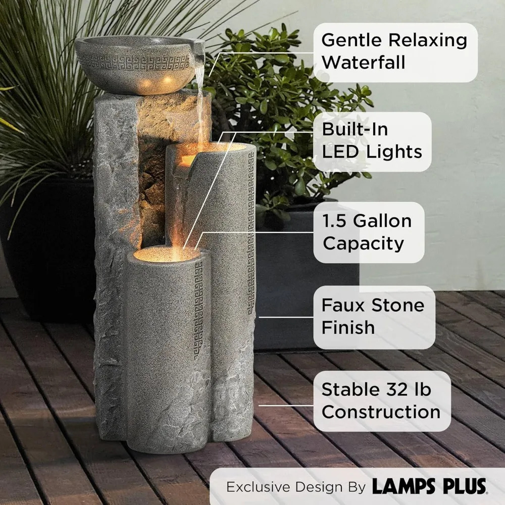 【Relaxing Water Fountain】Faux gray stone marble finish. Cast resin construction. Water flows through 3 levels for added sound and vision. Plug-in garden or patio fountain. Comes with water pump, connectors, and a 5-foot long cord with a 3-prong plug.
