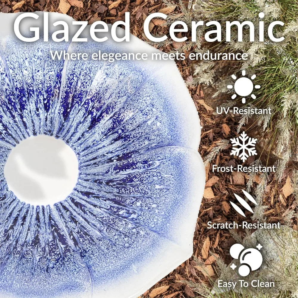 - DURABLE CONSTRUCTION: Made from frost- and UV-resistant ceramic, this stylish heavy-duty bird bath with pedestal features an elegant glazed white finish with a unique blue mist design in the bowl.